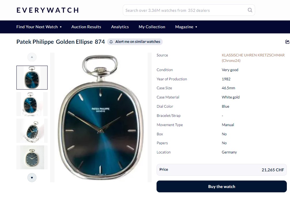 The exact same watch is offered on the market for three times (!) its auction price. Such deals are quite frequent at auctions and you will learn where to find them.
