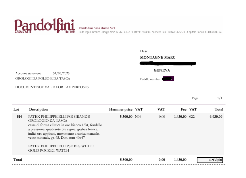 Here's an example of an invoice for a very rare Patek Philippe watch that only appeared twice at auctions. Thanks to the learnings shared in this course, I was able to not miss this opportunity!